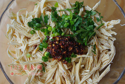 5、加辣椒油、盐、香油、葱、香菜末拌匀即可。