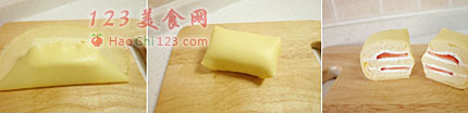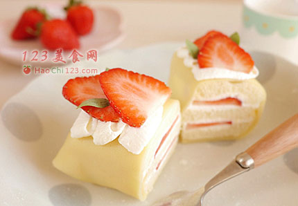 10、然后用可丽饼将草莓蛋糕包裹起来,将封口朝下放,然后切开,最后在可丽饼卷上挤一点奶油,摆上草莓片做装饰就好了。