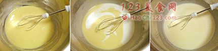 3、分次加入125毫升牛奶,每次加入都混合均匀。一次加入太多会使粉类结块。
