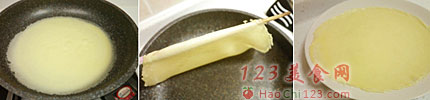 7、看到表面干了就可以翻面了,先熄火,再慢慢的将薄饼翻过来,如果你觉得做不好,可以拿一根筷子,将薄饼的一边翻上来,挂在筷子上,再将筷子抬高,就可以很容易的翻面了。另一面稍微煎一下就好,因为饼很薄,煎好后拿出放在案板或者盘子上冷却备用。这个量一共可以做出5张薄饼。
