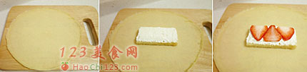 8、在薄饼里主要是加入水果、奶油、蛋糕,水果可以随意选择自己喜欢的:草莓,猕猴桃,芒果都很适合,奶油可以换做巧克力,蛋糕也可以自由选择,自己制作的蛋糕片,或大蛋糕切成薄片都可以。先在案板上将薄饼铺平,摆上一小块蛋糕片,再抹上一层打发好的奶油,接着铺一层草莓片。