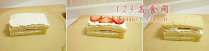 9、照上面的顺序再铺一遍:蛋糕片,奶油,草莓片,最后盖上一片蛋糕。