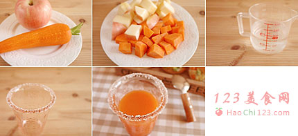 贴士:若没有榨汁机,也可以用搅拌机来做,将处理好的所有用料放入搅拌机,加入150毫升纯净水,搅打后将果汁过滤即可。蔬果汁可以搭配蛋饼来做,可以将过滤掉的蔬果渣放入蛋液中做成蛋饼。[LaoYanHuo.com]