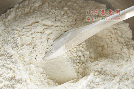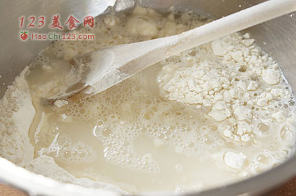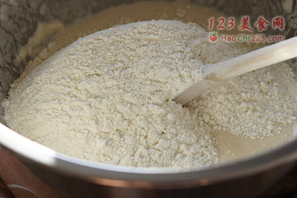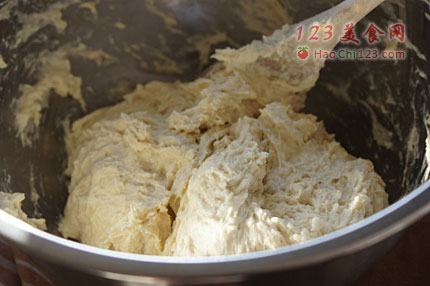 4、加入剩余的3杯面粉和3汤匙高筋面粉,继续用木勺搅拌均匀。此时搅拌有点困难,大家要有耐心,付出一些手臂力量。