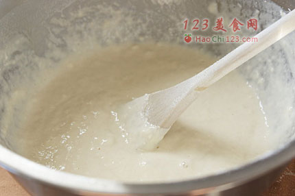 3、用木勺搅拌均匀成顺滑的面糊,静置3分钟。