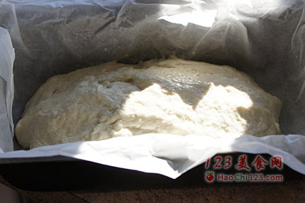 8、30分钟后,面包发好了,割包或者不割都可以,我撒了些Polenta就是意大利的玉米粉。