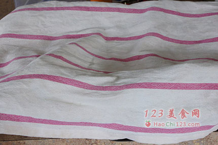 7、盖上湿润的毛巾,发酵30分钟。夏天时间可以缩短一些(一定要注意哦。发酵时间太久就会过头,面包会失败。人家是急性子,所以做面包是最好调闹钟),面包开始发酵时,烤箱通电,预热至200度。