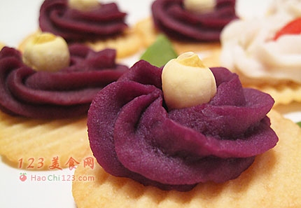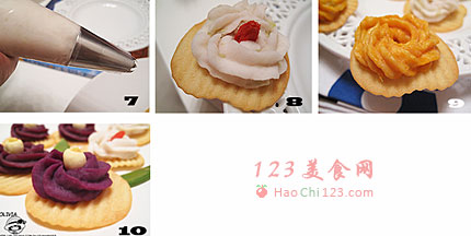 6、用制作曲奇的手法在薯片底座上挤出花形,用莲子做为花蕊稍加装饰。