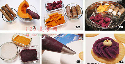 7、依次做完紫薯玫瑰后,按上述方法制作山药泥和南瓜泥。换新裱花袋,装入山药泥。