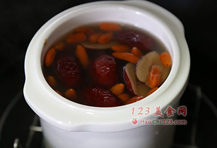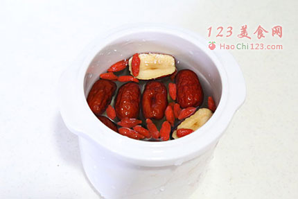 4、兵分两路,另外一个锅里,把红枣去核,枸杞洗净后与阿胶放入炖盅内。