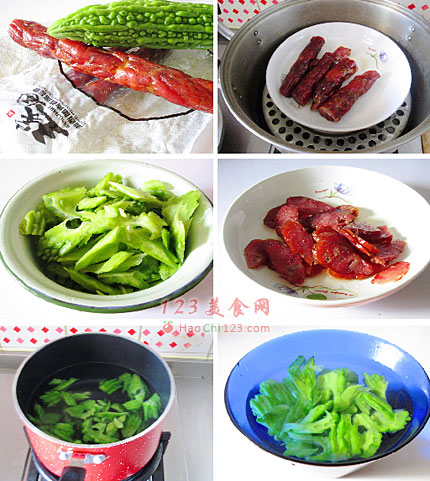 2、让苦瓜不苦其实很简单,就是将苦瓜沿着苦瓜上面条文的方向剖成两片,去子后,把紧贴瓜肉的一层白色瓜瓤去除干净,可以有效去除部分苦味。也可以将切好的苦瓜用开水烫过后马上用冷水冲凉,这样苦味也会减少很多。