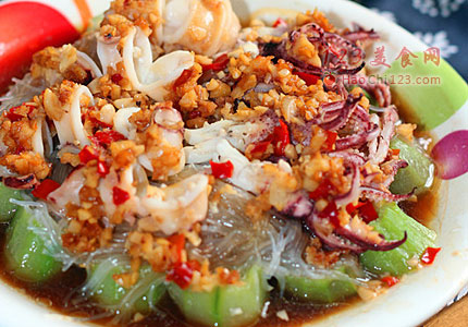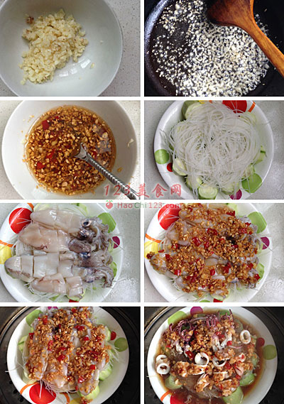 12、拌好的一碗蒜米汁铺在鱿鱼之上。