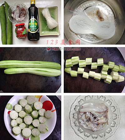 10、泡好的粉丝剪断,铺在丝瓜上。