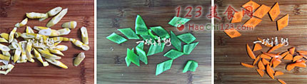 9、胡萝卜切成菱形。