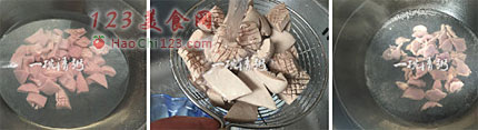 10、冷水和腌制后清洗干净的猪腰一同下锅,待猪腰变色后起锅。