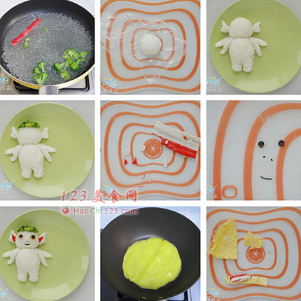 11、保鲜膜将米饭团出胡巴的身体和四肢。