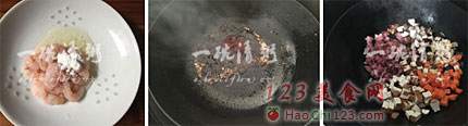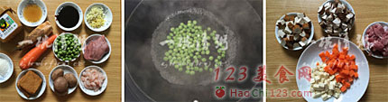 6、随后放入黄酒、猪肉丁、冬笋丁、豆腐干丁、香菇丁和胡萝卜丁翻炒片刻。
