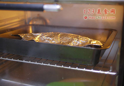 5、入预热烤箱200度上下火35分钟。取出撒孜然、辣椒面再入烤箱烤5分钟即可。