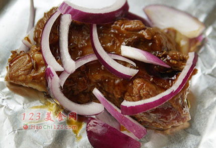 4、煎好的羊排放入铺有锡纸的烤盘内,加洋葱。用锡纸让羊排包裹好。