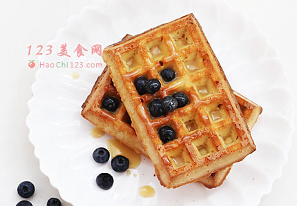 10、在烤好的华夫饼上淋上奶油焦糖酱,也可抹上巧克力酱,或者鲜奶油等你喜欢的食材。