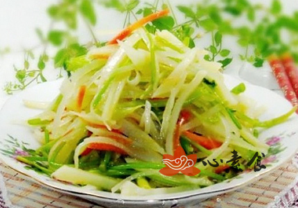 3、炒锅倒锅,放胡萝卜丝、土豆丝快速翻炒。
