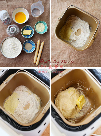 1、将面包桶放入面包机,启动和面程序,时间10分钟。