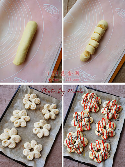 9、依次打开并首尾相接盘为花型,放入铺好油布的烤盘上,进行最后发酵。