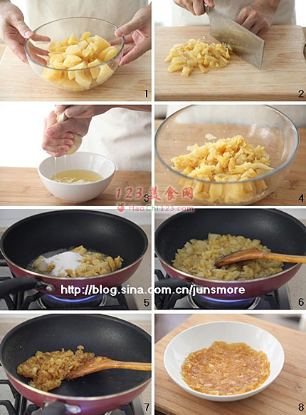 2、菠萝切丁以后,挤干水是为了进一步缩短炒馅的时间。如果你不嫌麻烦,也可以不挤干水直接炒馅(100克罐头糖水就可以省略了)。时间会更长一些。