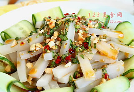 9、盘子底用黄瓜片装饰,中间放上猪皮冻,浇上蘸料。