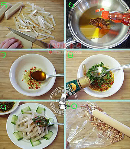 7、捞出花椒,将烧热的油淋在蒜蓉、姜蓉、干辣椒碎上。