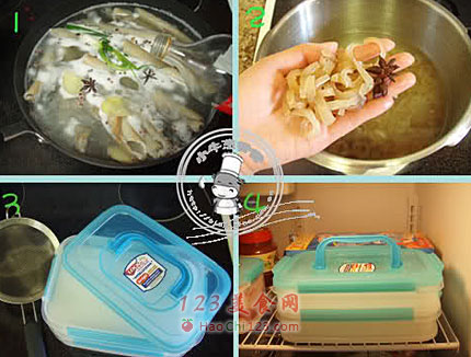4、待猪皮汤完全冷却以后,将保鲜盒放入冰箱,等其凝固即成猪皮冻。