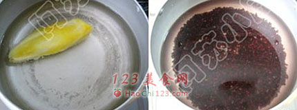 3、将紫米洗干净,加入芒果水,用小火煲,直到软糯鲜滑后加糖搅拌均匀出锅。