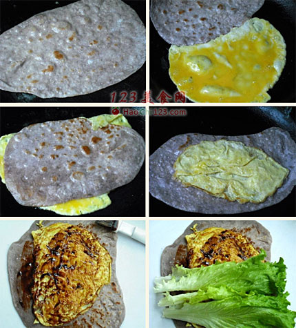 6、将已经粘在一起的蛋饼,刷上一层甜面酱,铺上生菜,卷好即可。