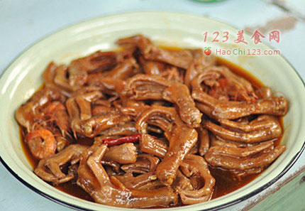 2、虾变色之后放入焯水好的鸭掌。