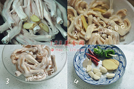 2、3、焯水过的鸭掌倒出来,用清水冲洗干净,把浮沫都冲去,沥水。