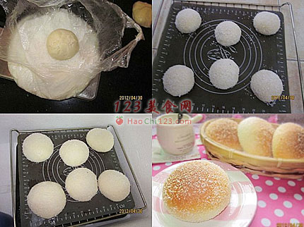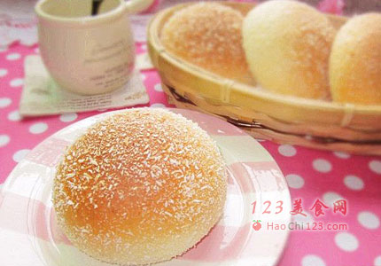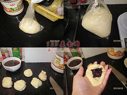 4、将松驰好的面团滚圆,压扁,包上适量的果酱(一定不能多,一多就吐啊),包上口,再次滚圆,将包好的面团放进椰丝里,让它粘满椰丝,放进烤盘里,再次发酵至2倍大,烤箱170度预热,中层上下火12分钟即可。