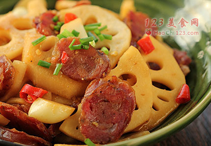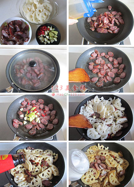 2、将腊肠的油脂煸炒出来后,加入大料翻炒出香味,再加入藕片翻炒后加入点酱油和蚝油上色提鲜;这时加入点水焖煮熟,最后加入盐调料即可。