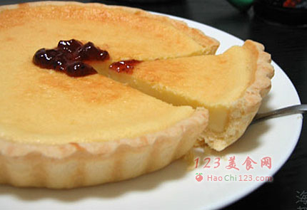 2、烤好的乳酪派冷却后,在表面挤上蓝莓酱作为点缀即可。彻底冷却后可入冰箱存放。
