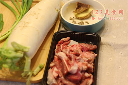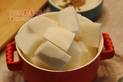 2、萝卜削皮切块。