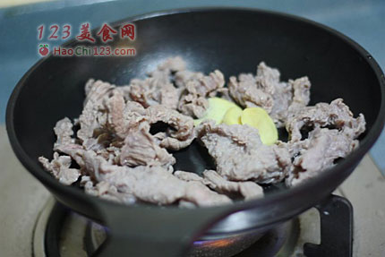 4、把焯水后的牛腩爆干水,加入姜片爆出香味。