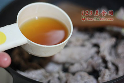 5、将黄酒加入到牛腩中,拌匀。