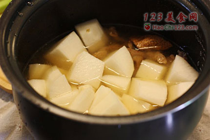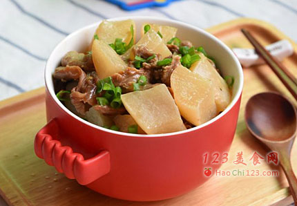 7、清汤牛腩裏白萝卜饱吸浓郁的肉汤,肉汤浸透白萝卜的清甜,两者相辅相成。