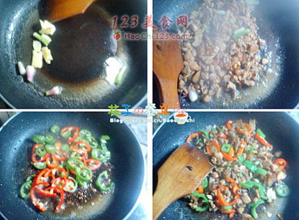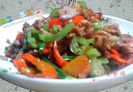 4、锅内留有油,倒入切好的辣椒圈,炒至辣椒变软后,把碗中炒好的肉丁倒入锅中,调入适量的盐(因为肉里面有了咸味了,所以放盐一定要注意),撒入葱段,翻炒几下就可以起锅了。