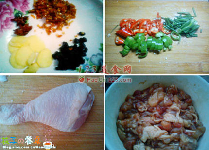3、起锅烧热放入少量的油(因为鸡油本身就有油,所以油不能放多),下葱头与姜片爆发后倒入腌制好的鸡肉丁,炒至肉变色后起锅盛入盘中待用。