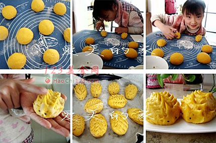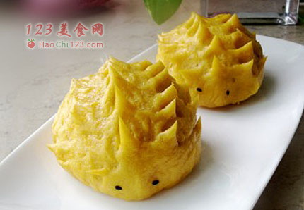 7、做小刺猬时将面团揉圆头部稍尖,身体用小剪刀剪出一根根小刺,点上黑芝麻眼睛即可。