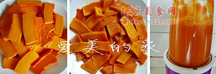 2、将蒸熟的南瓜用搅拌机打成糊(或用勺子捣成糊),稍凉一会感觉不烫时加入干酵母,拌匀至酵母溶解。
