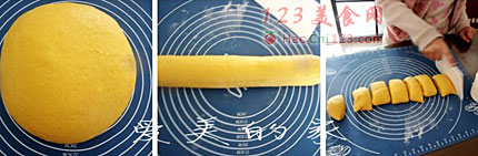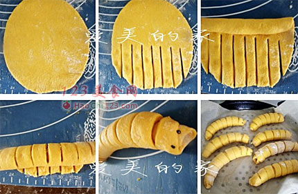8、做毛毛虫时将面团擀成圆形饼状,将饼下端用刀切一根根条状,从上部往下卷起,收口处捏紧,点上黑芝麻做眼睛即可。