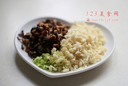 3、香菇洗净泡发后,挤去水分,切小丁。