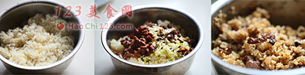 6、将香菇丁、笋丁、牛肉丝、葱姜碎放进蒸好的饭里,倒入一点老抽和生抽、橄榄油、麻油拌匀。