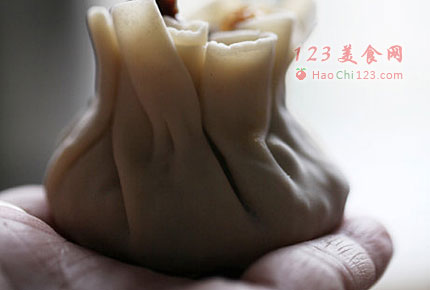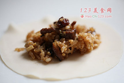 8、取一勺馅料,放在烧卖皮子里,用手窝成烧麦模样。